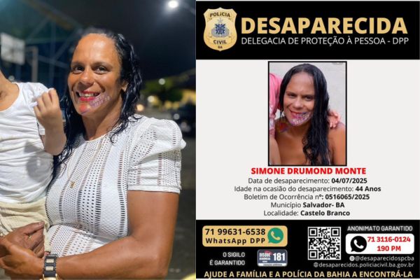 Qualquer informação sobre o paradeiro da mulher deve ser passada para a polícia através do disque denúncia 181, ou para o Departamento de Proteção à Pessoa (DPP), por meio do telefone (71) 99631 6538.
