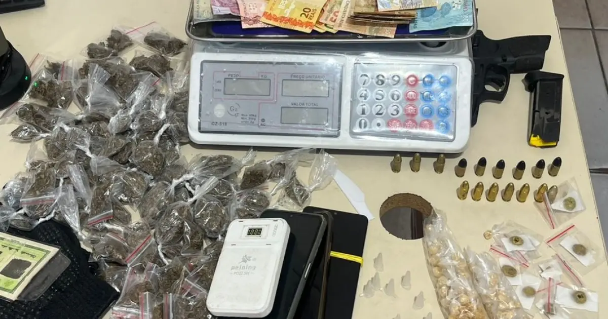 Após as buscas, os policiais encontraram uma pistola calibre 9mm, munições dos calibres 9mm e .38, 108 porções de maconha, 10 embalagens contendo haxixe, oito pinos de cocaína, dois sacos com crack, uma balança de precisão e R$ 687 em espécie.