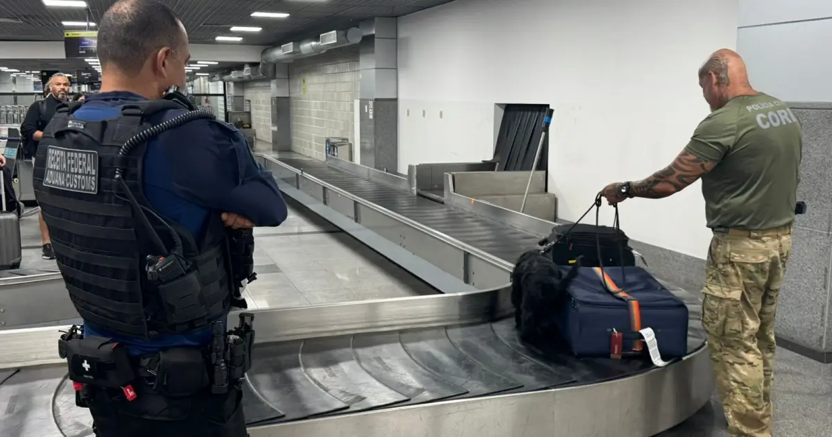 As bagagens dos passageiros são inspecionadas integralmente, utilizando scanners e o apoio dos cães farejadores da Polícia Civil. No total, participam da operação 8 servidores da Receita Federal, 4 policiais civis e 2 cães.